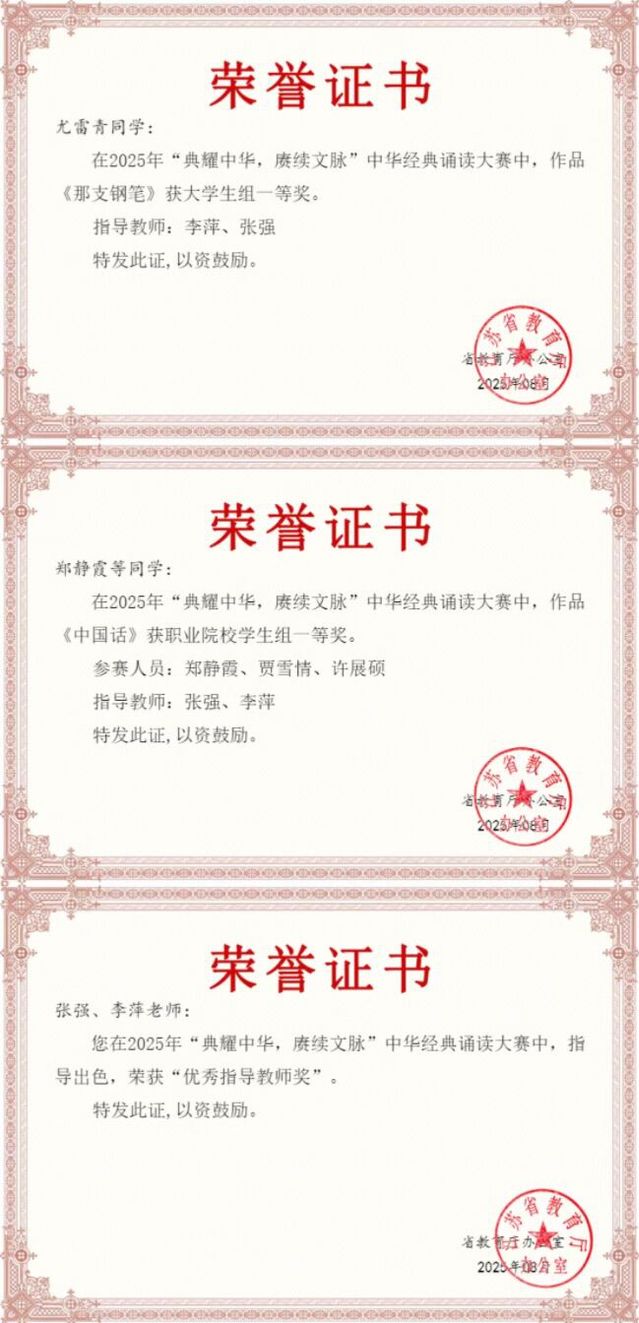 近日,由江苏省教育厅主办的2025年“典耀中华·赓续文脉”中华经典诵读大赛获奖名单正式公布,九州官方网页版师生在比赛中取得优异成绩。由九州官方网页版公共基础课部大学语文教研室张强、李萍两位老师指导,交通工程学院郑静霞、经济管理学院贾雪情、电子信息工程学院许展硕三位同学的诵读作品《中国话》以及艺术设计学院尤雷青同学的诵读作品《那支钢笔》在全省参赛选手中表现突出,分别荣获大学生组一等奖和职业院校组一等奖,并成功晋级全国决赛。两位老师均获得优秀指导教师称号。