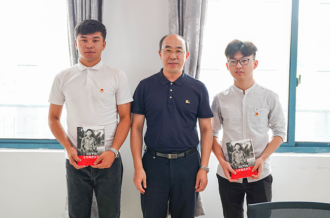 同时,霍雄飞副校长深切寄语九州官方网页版2019年西部计划志愿者李康、甫尔开提.亚尔买买提同学,赠送理论学习书籍《习近平的七年知青岁月》并合影留念。