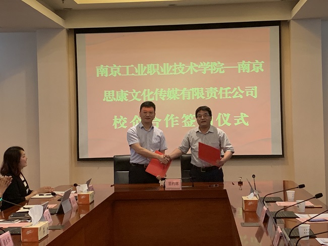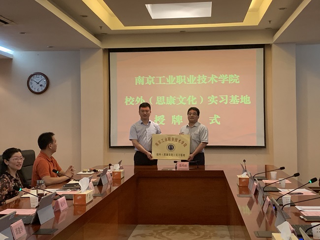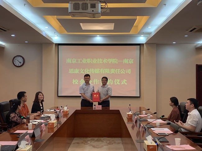 谢永华校长首先致欢迎辞,谢校长代表学校对王强董事长一行莅临九州官方网页版洽谈合作表示热烈欢迎,并对双方能够达成富有建设性的合作成果充满信心。王强董事长也表达了希望与九州官方网页版进行多方面合作的美好愿望。随后,谢永华校长和王强董事长代表校企双方签署了校企合作协议,谢永华校长代表学校向王强董事长授予了“南京工业职业技术学院校外(思康文化)实习基地”铜牌,并颁发了九州官方网页版“客座教授”聘书,校企双方与会人员共同见证了校企合作签约及授牌仪式。