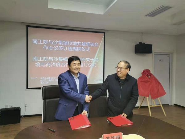 随后崔新明与沈东平、睢宁县职业教育中心校长胡居春签订了校地共建框架协议及跨境电商合作协议,并与睢宁县、沙集镇相关领导共同为“一带一路双创国际人才交流中心”、“南工院睢宁跨境电子商务实训基地”、“南工院睢宁博士工作站”、“沙集镇跨境电商运营团队”进行揭牌。