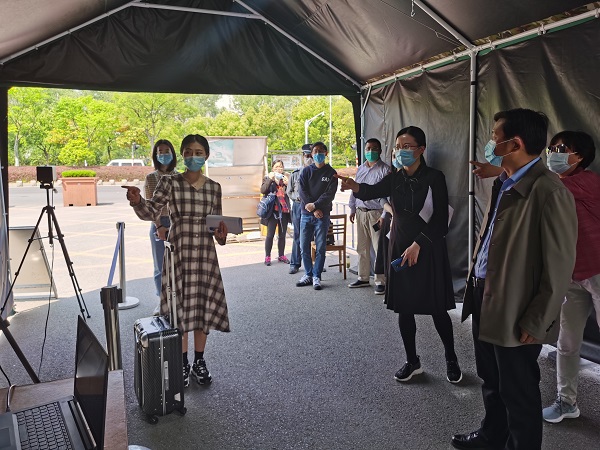 首先,大家在学校西门报到处模拟报到过程中学生体温异常的情况,按照前期制定的返校方案,分别进行在应急处置点进行二次体温测量、班主任和辅导员到场处置以及联系医务人员进行进一步检测等演练流程。 随后,大家来到学生宿舍进行宿舍异常应急处置演练,当学生在宿舍出现体温异常,由宿舍长将情况汇报给宿管站,联系医务人员到场处置,同时班主任和辅导员到场进行应急处置,并将学生情况上报学院和学工处,确保第一时间知晓学生的基本信息和健康情况。