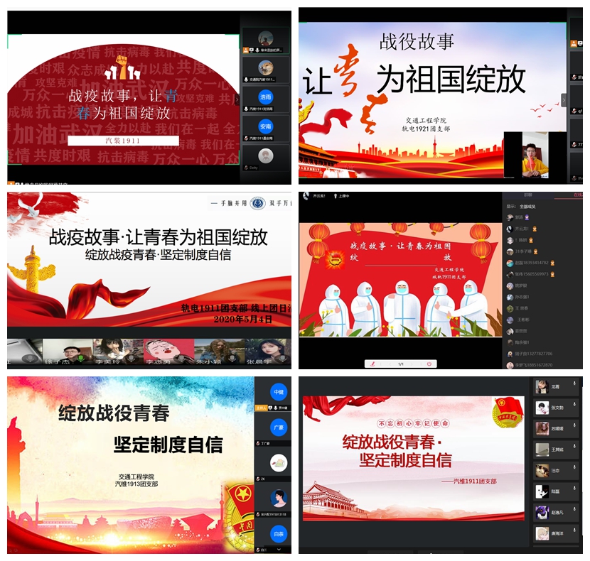 交通工程学院各团支部,通过线上形式开展“战疫故事·让青春为祖国绽放”主题团日活动。此次线上“云”分享,交流抗疫过程中的青春故事,身边同学在当地抗击疫情志愿服务时的经历,展现了青春力量,坚定了抗疫信心。分享青年人自己的抗疫故事,充分营造出众志成城、团结一心、携手抗疫的浓厚氛围。通过团日活动强化了青年学生树牢“四个意识”,坚定“四个自信”,做好“两个维护”,更加坚定了同学们对中国特色社会主义制度的自信。轨电1911团支部、轨电1921团支部、汽装1911团支部等深入学习探讨,分享交流,在纪念五四运动101周年之际,在抗击疫情的关键时期,进一步坚定制度自信,汇聚战疫青春力量。