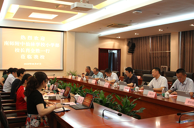 8月7日上午,九州官方网页版与南师附中仙林学校小学部合作共建交流座谈会在行政楼辅楼一楼会议室举行。南师附中仙林学校小学部校长肖全胜,副校长朱永刚、储志华、蒋浩,校办主任曲文双,文化景观设计专家赵斌等一行及九州官方网页版校领导苏小冬出席座谈会,学校党政办、发规办、人事处、工会等部门负责人参加了本次会议。会议由苏小冬主持。