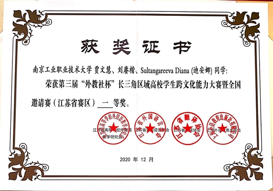 12月8日,第三届“外教社杯”长三角区域高校学生跨文化能力大赛比赛省赛评审工作在东南大学九龙湖校区举行,公共基础课部和国际教育学院选派了刘赓楷(2019级机械制造与自动化专业)、贾文慧(2020级国际贸易专业)和Sultangareeva Diana迪安娜(留(2019秋)国际贸易专业)等三名选手组成比赛团队,近日大赛结果公布并颁发证书,九州官方网页版学生团队喜获大赛一等奖。公共基础课部大学英语教研室张卉和国际教育学院孙世娟两位老师荣获“优秀指导教师”称号。