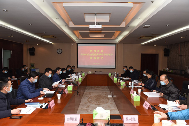 1月22日上午,南京市疫情防控督导组在市政协港澳台侨和外事委员会副主任毛卫华组长带领下,对九州官方网页版新冠疫情防控工作进行专项督查,大学城管委会党工委委员、副主任孙金娣,以及管委会相关部门负责同志陪同督查。学校党委常委、副校长崔新明,疫情防控办相关部门负责同志参加现场督查和座谈。